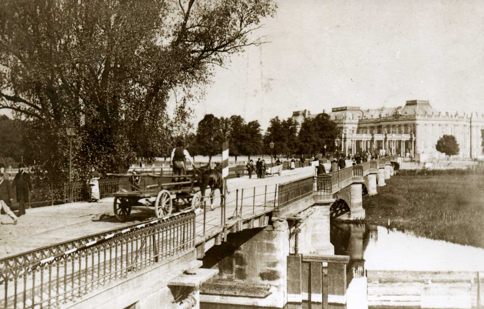 Die Lange Brücke in den 1870er Jahren. Das ist noch die Brücke, die 1825 gebaut und 1888 durch eine neue ersetzt wurde. Hier konnte man noch die Fahrbahn über der Durchfahrt hochklappen.