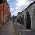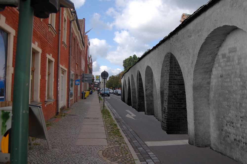Jetzt kommen wir wieder etwas spielerisch zurück zur Stadtmauer. Sie lief vom Nauener Tor weiter die Kurfürstenstrasse entlang um dann in die Hebbelstrasse abzubiegen. Die Mauer kann wirklich nur wenige Meter von den holländischen Häusern entfernt gestanden haben.