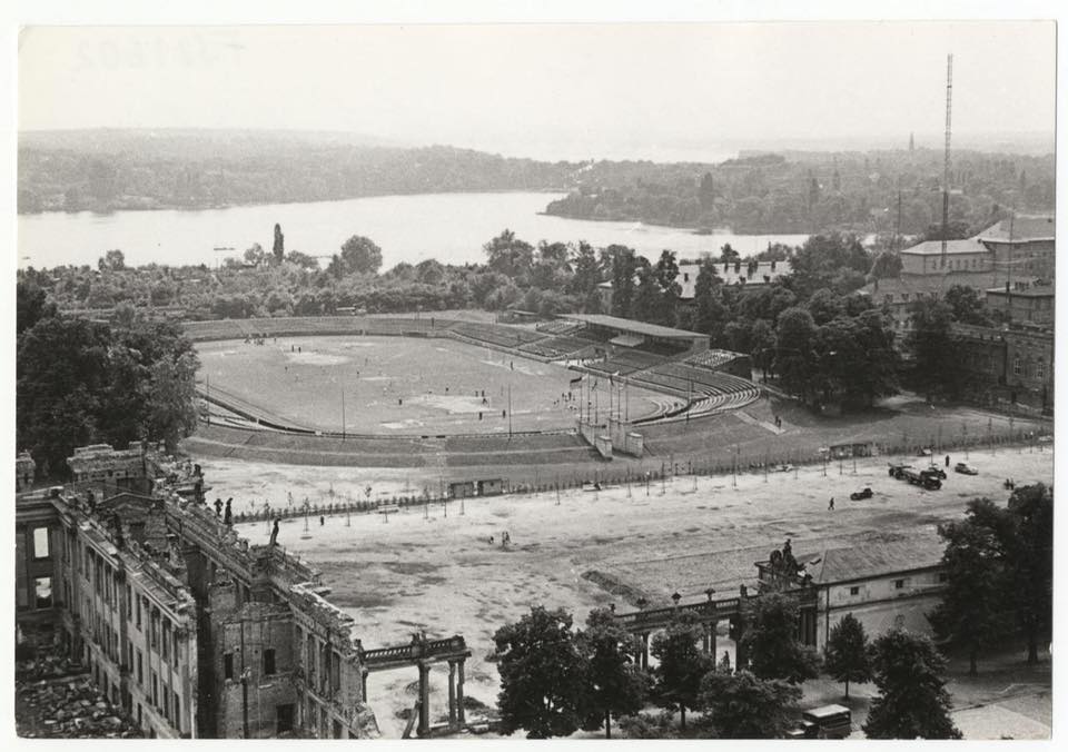 StartseiteAllgemeinNochmal das Thälmann-Stadion um 1950. Im Vordergrund die Reste des Stadtschlosses und der Paradeplatz. Die Breite Str in der heutigen Form gab es noch nicht.